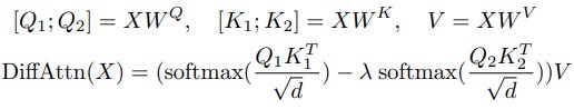 Attention noise in this case refers to attention that is given to unnecessary tokens. In the paper, a new unit called the differential transformer is proposed. The operation can be seen in the equations below.