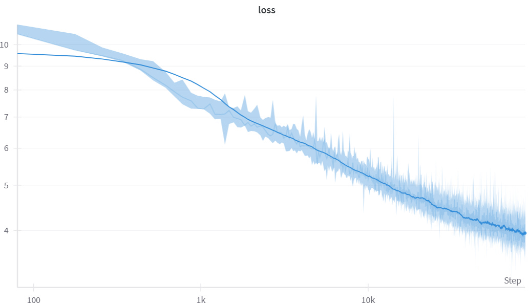 In order to keep the parameter count similar, I used an embedding size of 512 with 8 total heads. The final parameter count of this model was 111M total parameters including the embedding layer. This is ~6M smaller than GPT-2 small and ~13M smaller than our baseline. In total, I was able to run this model for ~16 hours on an H100 on ~2.7 million total examples.