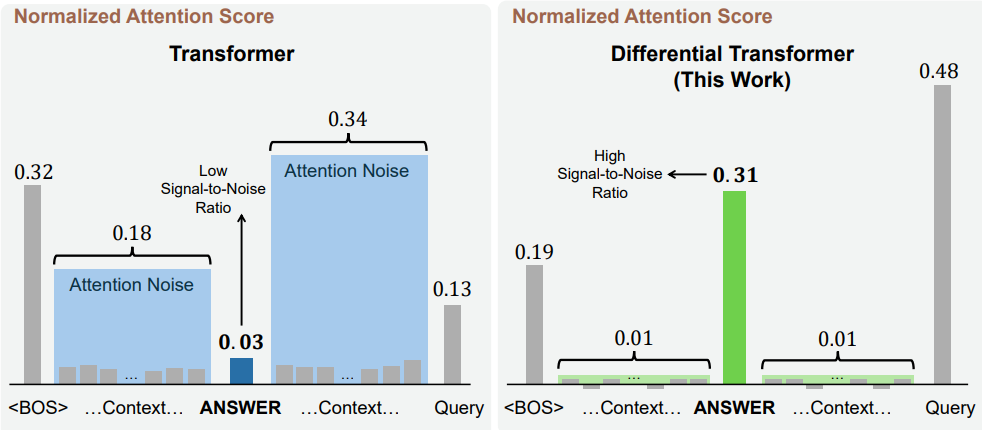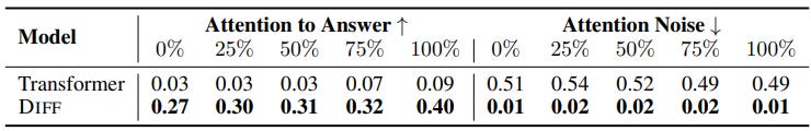 The basic idea is to use two sets of keys and queries to denoise each other. From there, the self-attention operation proceeds normal. The paper found that this unit approach greatly reduced attention noise in transformers. In the table below, normalized attention scores a shown for a model in an information retrieval task. The percentages represent the total amount of the model’s context length that was used.